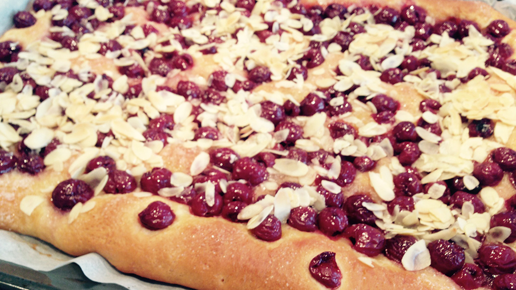 Kirschen gut abtropfen lassen. Teig durchkneten und auf einem gefetteten Backblech ausrollen. Kirschen gleichmäßig auf dem Teig verteilen und mit 75 g Zucker bestreuen. Nochmals ca. 15 Minuten gehen lassen.