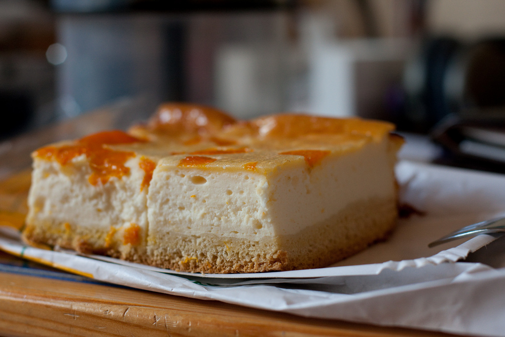 Der Kuchen wird bei 175°C für etwa 80 Minuten gebacken. Wenn der Kuchen erkaltet ist, mit Tortenguss überziehen.